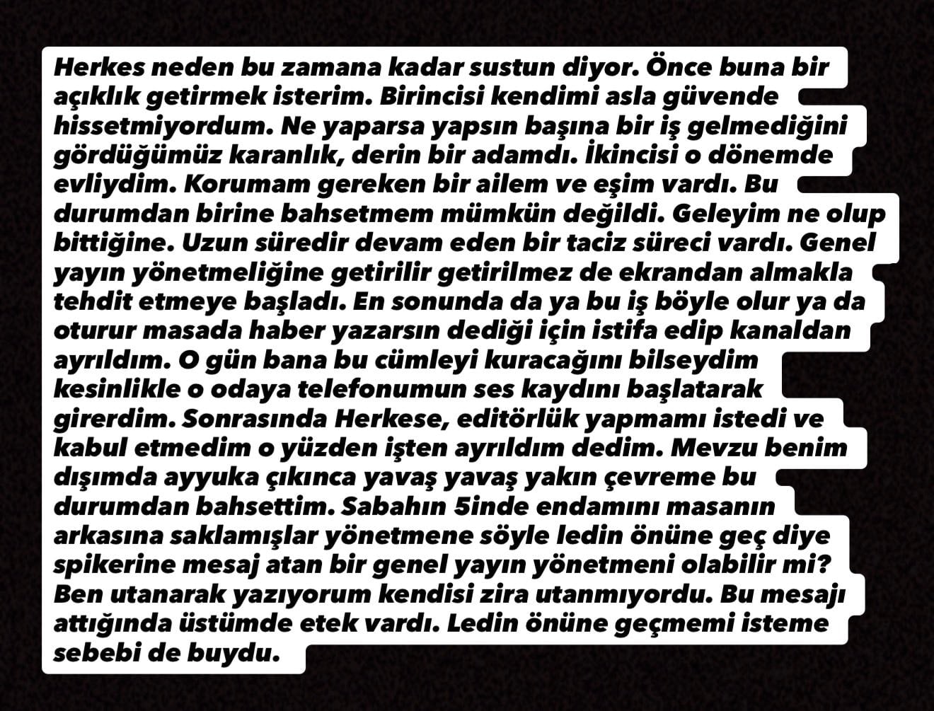 Uzun süredir devam eden bir taciz süreci vardı. Genel yayın yönetmeliğine getirilir getirilmez de ekrandan almakla tehdit etmeye başladı. En sonunda da ya bu iş böyle olur ya da oturur masada haber yazarsın dediği için istifa edip kanaldan ayrıldım. O gün bana bu cümleyi kuracağını bilseydim kesinlikle o odaya telefonum ses kaydını başlatarak girerdim.
