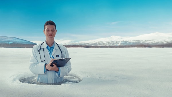 Videoda, doktor rolündeki karakter, İsveç’in dondurucu göllerinde yarıya kadar suya batmış halde ya da 24 saatlik güneş ışığında dinlenirken ‘parasempatik rahatlamadan’ bahsediyor.